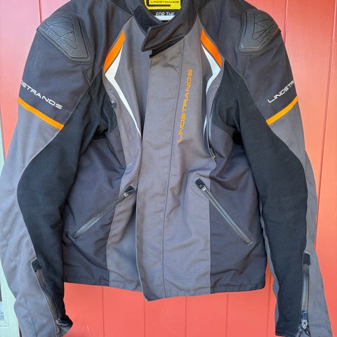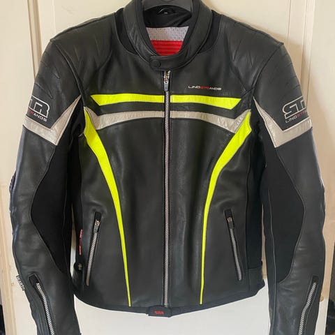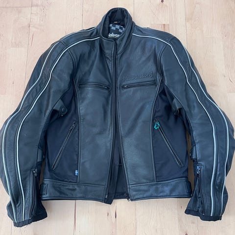 Lindstrands Cougar motorcykeljacka för herr i skinn med detaljer i textil. Jackan är svart med vita partier och ränder samt emblem på axeln. Storlek 54. Tillverkad i ko-läder (cow) med inslag av canvas och HI-ART-material enligt etikett. Flera dragkedjefickor framtill och dragkedja som huvudstängning. Passar som skyddande ytterplagg vid motorcykelkörning.