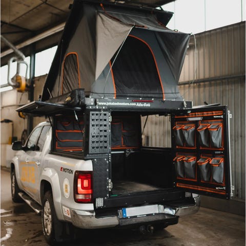 Kabe husvagn i röd och vit färg. Dubbelaxlad modell med dragkrok framtill. Flera fönster längs sidorna samt bakruta. Invändigt är vagnen i behov av renovering med delvis utriven inredning och synligt golv och väggar. Utrustning och planlösning kan vara ändrad eller ofullständig jämfört med originalutförande.