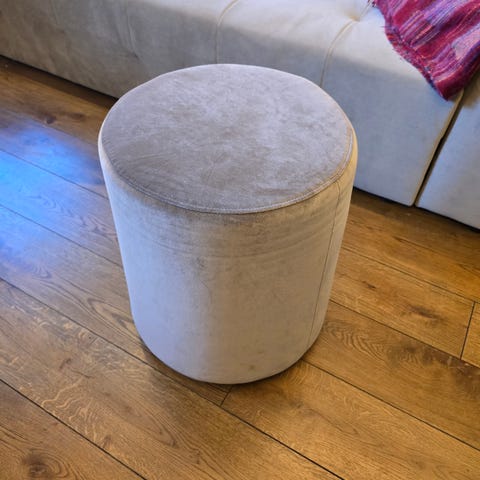 Sweef rund sittpuff i grå sammet med dekorativ rem i läder. Puffen har en cylindrisk form och är klädd i mjukt tyg som ger en ombonad känsla. Passar som extra sittplats, fotpall eller sidobord i vardagsrum, sovrum eller hall.