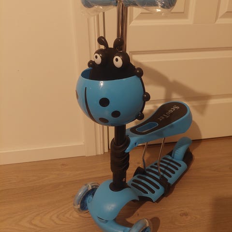 blå 5-i-1-sparkcykel med nyckelpiga för barn, sadel och körhandtag