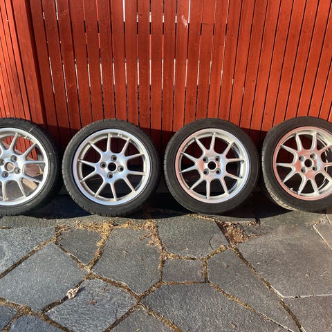 Fälgarna har kantskrap men bara kosmetiskt fult. Däcken är nästan nya har 7-6mm mönsterdjup kvar. Priset är 4500kr för alla fyra hjul