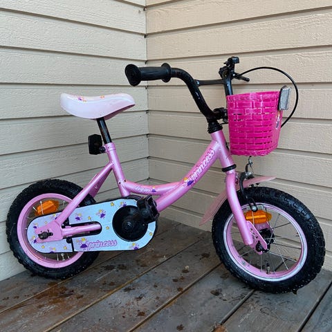 Barncykel med 12" hjul i blå och rosa färg. Utrustad med vit sadel, vita skärmar och vit framkorg i plast. Cykeln har kedjeskydd, handtag med skydd och reflexer i hjulen. Passar mindre barn som ska lära sig cykla eller använda som första cykel.