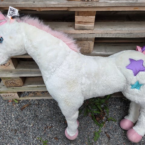 Jättegulligt huvud av en vit och mjuk enhörning med hår och silverfärgat horn. Sätts på väggen med hjälp av en ögla. Aldrig uppsatt i barnrummet.