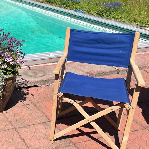 Två stycken fällbara regissörsstolar i trä med vit textilsits och ryggstöd. Stolen har armstöd och kryssben som kan fällas ihop för enklare förvaring. Sits och rygg är i tyg med ljus färg och visar vissa fläckar enligt bild. Passar exempelvis på balkong, altan eller som extra sittplats inomhus.