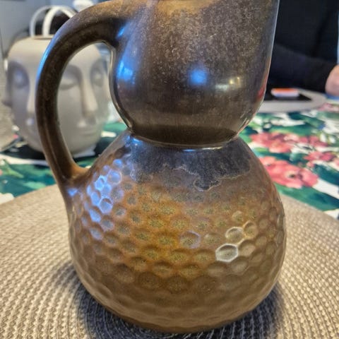 Kanna i glas med bubblig, knottrig struktur runt hela kroppen. Glaset är mörkt tonat och har ett greppvänligt handtag. Öppningen är rund med markerad pip för enkel upphällning. Passar för servering av vatten, saft eller andra drycker samt som dekorativ inredningsdetalj. Höjs 24 cm hög