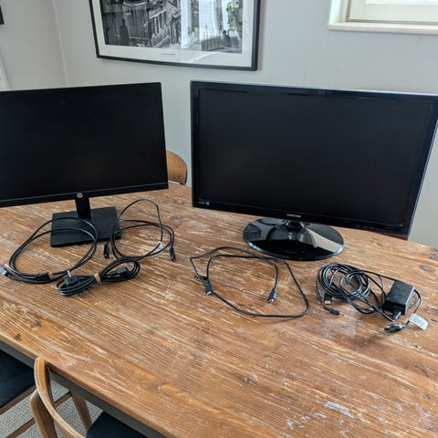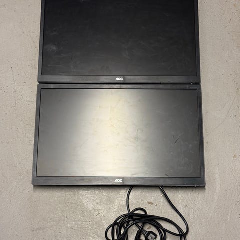 Dell 24 tum bildskärmar. Skärmarna har anslutningar som VGA, DVI och DisplayPort samt inbyggd USB‑hub med flera portar. De levereras med tillhörande kablar enligt bilderna, inklusive strömkablar och signalkablar. Passar för kontorsarbete, studier eller allmän datoranvändning där man vill använda en eller två externa skärmar.
