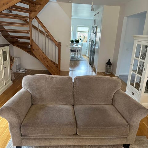Soffa, två stolar, benpall och bord