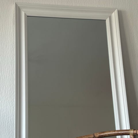 Spegel fastmonterad på vitlackad OSB-skiva. Ganska tung. 70x52 cm.