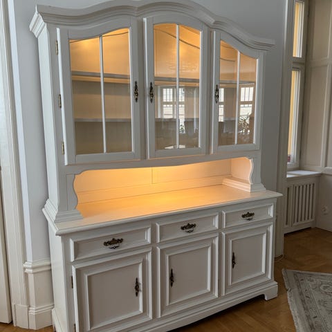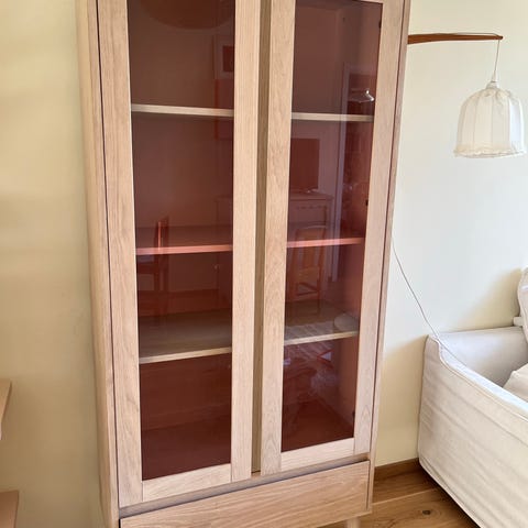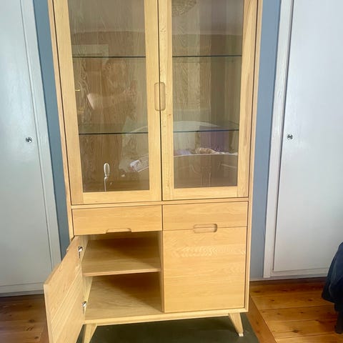 Säljer vårt fina vitrinskåp i lackerat ekfaner från MIO, modell Anja. Gott om plats för förvaring bakom en trädörr och en glasdörr med tre flyttbara hyllplan i trä. Kan även användas som klädskåp.