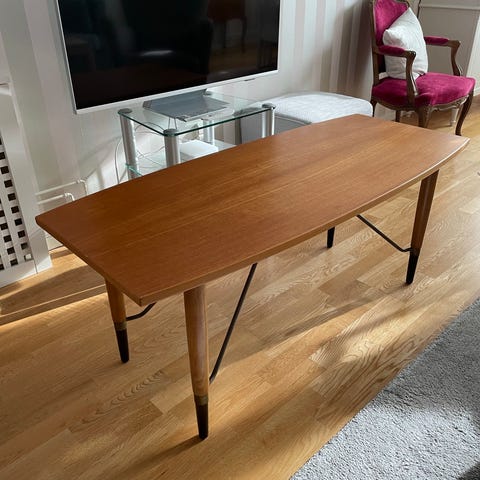 Snyggt soffbord med snygg detalj som underredet för tidningar i metall under. Mått på bordet bredd 114 djup 50 höjd 57. Hämtas i Bromma el Hornstull