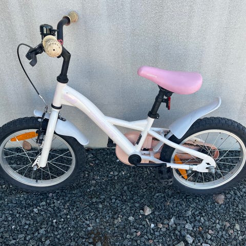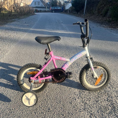 Mycket bra skick. Har endast används 1 säsong och passar perfekt som första cykel för barn som håller på att lära sig cykla, med extra stabilitet från stödhjulen och möjlighet för vuxen att hjälpa till via styrstången.