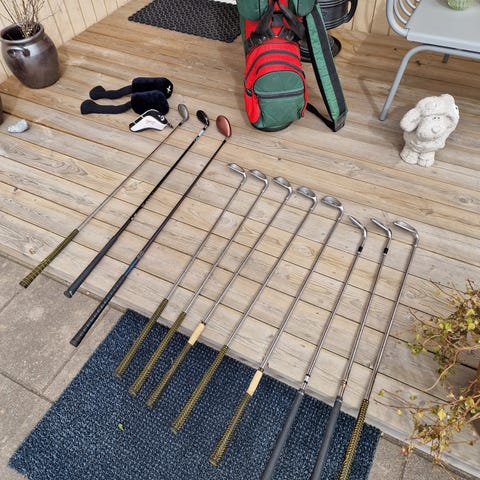 Hjälper min gamle vän att bli av med sina golfgrejer som inte använts på över tio år. Prylarna är fullt användbara från start, men jag skulle nog rekommendera att greppa om Goldwin-klubborna.