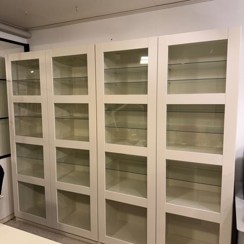 En hylla 80 cm tre styck 40 cm två med glasdörrar. 450 kr för 80 cm:s hyllan, 250 kr/st för 40 cm:s hyllorna med dörrar 150 kr för den utan dörr. 900 för alla samtidigt.