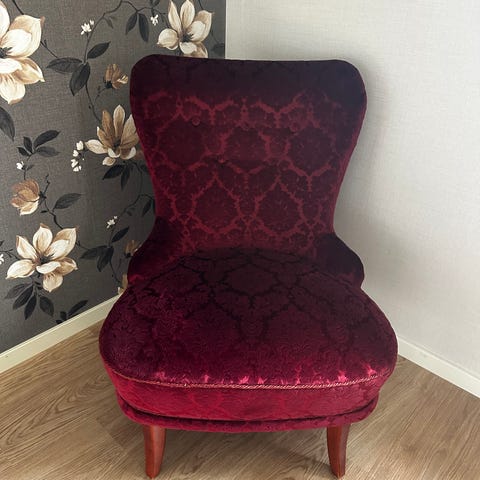 Liten nätt gammaldags Emma-fåtölj klädd med enfärgat sammetstyg i mycket gott skick. Knappt använd.