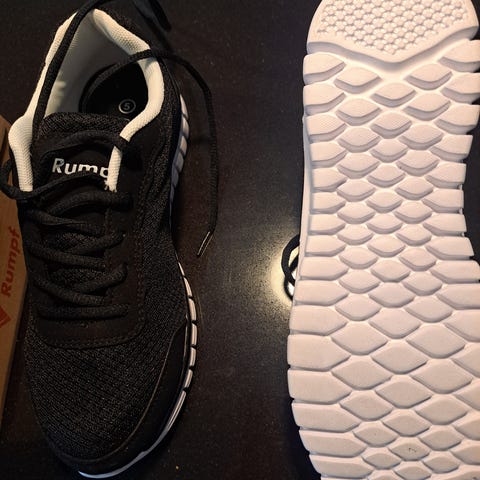 Modellen har svart ovandel och en låg, bred klack. Skon har en mjuk, ljus innersula och ett elastiskt band över vristen.