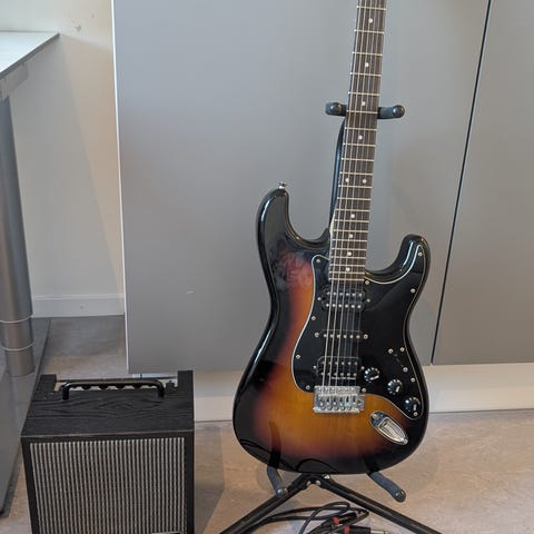 CB Sky elgitarr i svart utförande med ljust träfärgat greppbräde och hals. Kroppen har en klassisk dubbelcutaway-form med vit plektrumskydd. Elgitarren är lämplig för elförstärkt spel i olika musikstilar och kan användas både för övning och spel i mindre sammanhang.