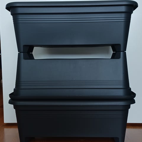 Placeras över balkongräcket och spänns fast med justerbar hållare för olika räcken. Avrinningshål nedtill med en liten vattenreserv i botten. Rymmer 16 liter jord. Odlingskupor med justerbart luftinsläpp.