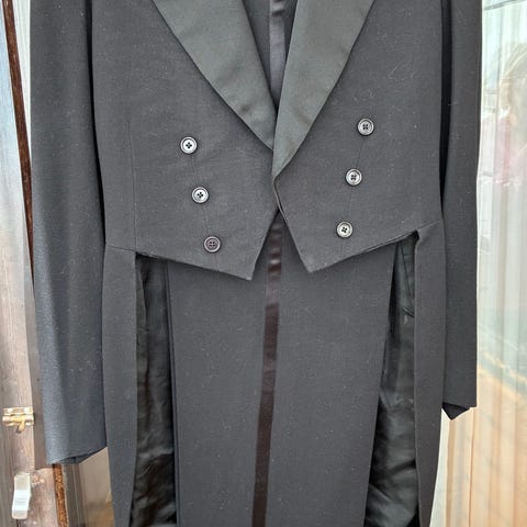 Frack 40/50-tal strl 46 med svart väst. Material: ull. Midjan är 80 cm men kan läggas ut 7 cm i den bakre sömmen. Innerbenen är 70 cm men kan läggas ned 3 cm. Frackens axelbredd är 45 cm. Ärmens längd 58 cm, kan läggas ned 3 cm.