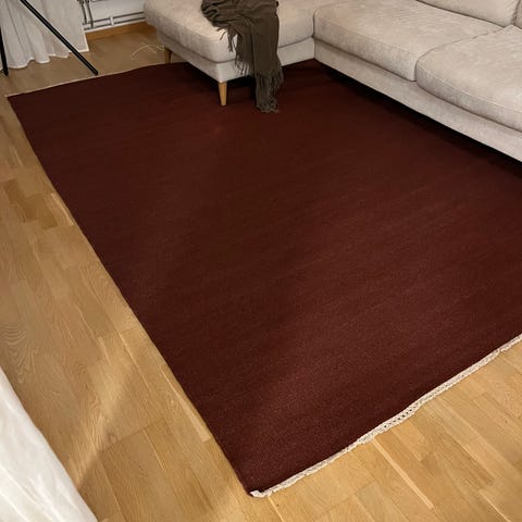 Matta i mjuk rya. Mattan är otroligt len, som en kaninpäls, och den tunna vackra och tätt sittande luggen skapar en böljande mattan beroende åt vilket håll man drar mattans strån.