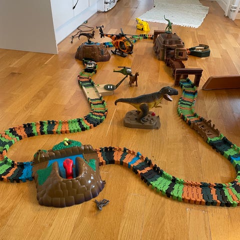Det finns en loop som är trasig, kan skicka med den om så önskas. Kanske går att laga. Har även en bil där ett hjul saknas som man kan få med om man vill försöka laga.