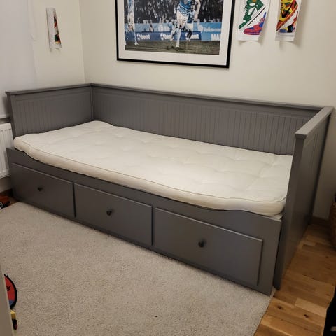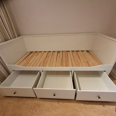 IKEA Brimnes dagbädd i vit färg med ribbotten och inbyggd förvaring i form av utdragslådor undertill. Sängen fungerar som enkelsäng (80 cm)och kan dras ut till större liggyta (max 160 cm) vid behov. Passar till exempel i sovrum, gästrum eller tonårsrum där man vill kombinera sittplats och säng med extra förvaringsutrymme under.