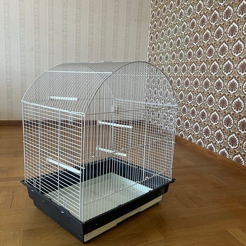 Stor fågelbur i grön metall med välvd topp. Buren har galler runtom och utdragbar bottenbricka för enklare rengöring.