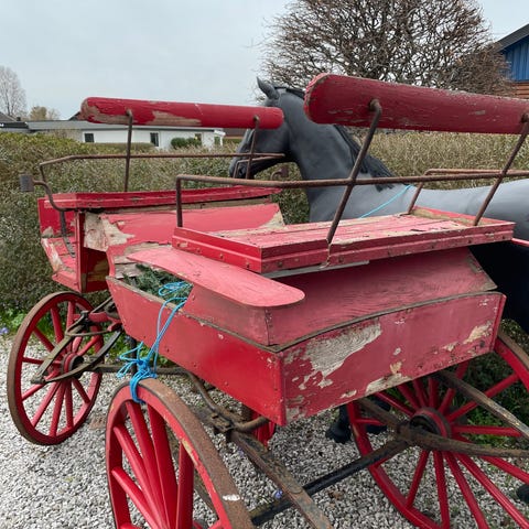 Hästvagn - Charabang i grön färg med fyra ekrade hjul. Vagnen har sittbänk framtill och baktill samt fotstöd. Passar för körning med häst, exempelvis fritidskörning eller brukskörning. Traditionell modell i gott skick med trä- och metalldelar samt stoppade sitsar. Har förvarats inomhus.