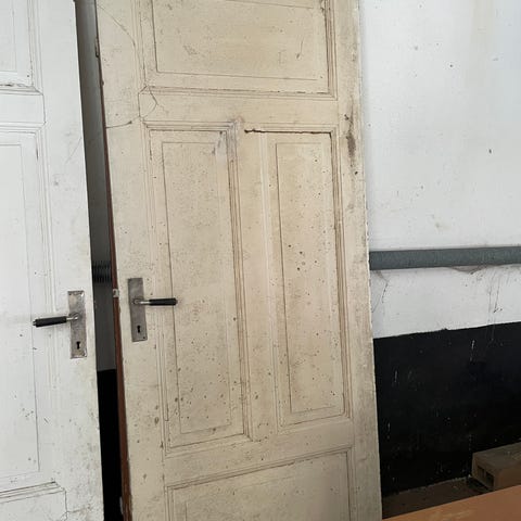 Träinnerdörrar i äldre stil i flera olika storlekar. Dörrarna är målade i vitt och grönt och har spegelindelning. Mått som syns på bilderna är bland annat cirka 85 x 175 cm, 84,5 x 174,5 cm, 90,5 x 211 cm, 80 x 191 cm och 81 x 187 cm. Passar som innerdörrar i bostad, förråd eller liknande där äldre utförande önskas. Dörrarna säljs utan angiven information om beslag och karm, se bilder för skick och detaljer.
