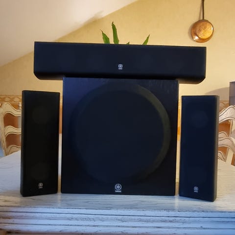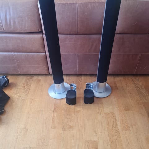 Hemmabiosystem som består av två golvhögtalare och en subwoofer.