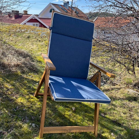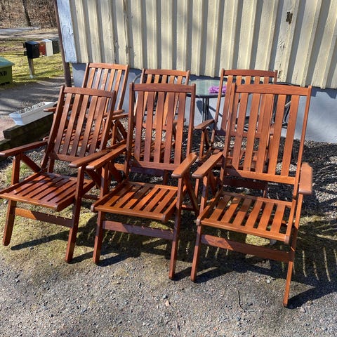 Brafab positionsstolar trädgårdsstolar 4 st med dynor. Tecken på användning finns, men dom är hela och stabila. Dynorna är förvarade inomhus, stolarna behöver torkas av efter vinterförvaring.