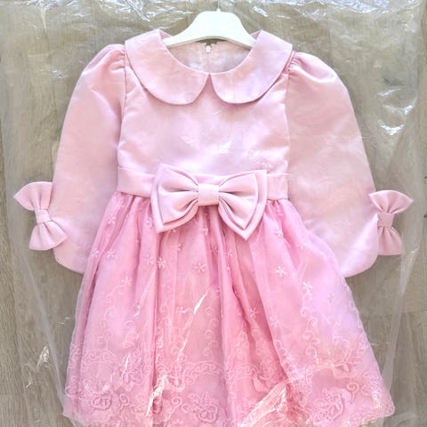 Ny Oanvända Rosa klänning för 7/8 åring med volanger och vita sidenrosetter ,bomullsfoder, dragkedja bak upp till midjan