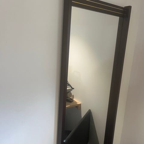 Spegel med äldre spegelglas och med ram i faner. 90 cm hög och på mitten 40 bred.