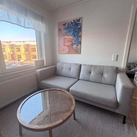 Superskön soffa med djup, dunkuddar med kallskumskärna och avtagbart tyg. Ben oljad ek. Tyg ljusblå/duvblå, mjuk men håller formen fint! Köpt 2019. Nypris 14000 kr,