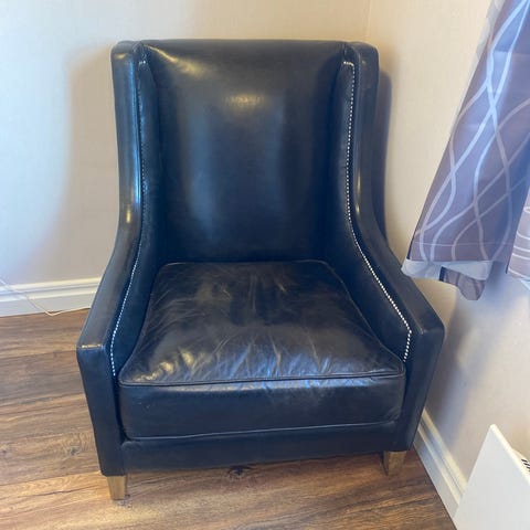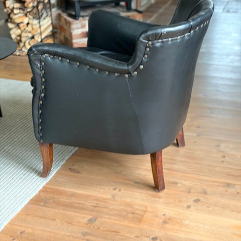 Mjuk skinnfåtölj på små hjul, två förstärkta.