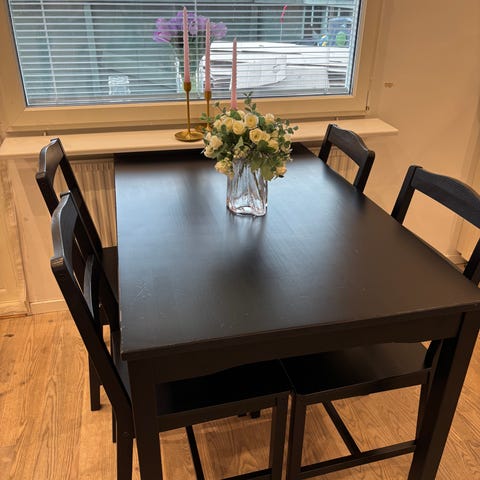 Fint och praktiskt slagbord med tillhörande två pinnstolar.