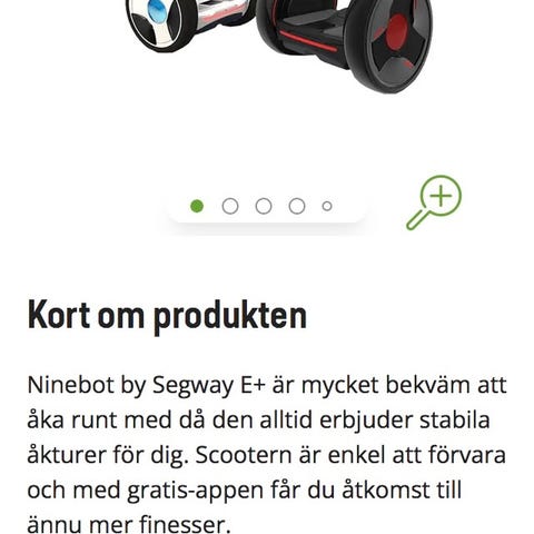 Ninebot by Segway Zing elsparkcykel. Modellen är utformad för barn. Max hastighet 15 km/h. Barn mellan 5- 10 år är lämpligt eller max längd 140cm. Fram- och bakhjul är massiva och därmed punkteringsfria. Sparkcykeln har fotstöd, bakre reflex och halkskyddat stådäck med Ninebot-logotyp. Ledljus som lyser upp upp undersidan på kvällen. Du behöver smörja och spänna bromsvajer.
