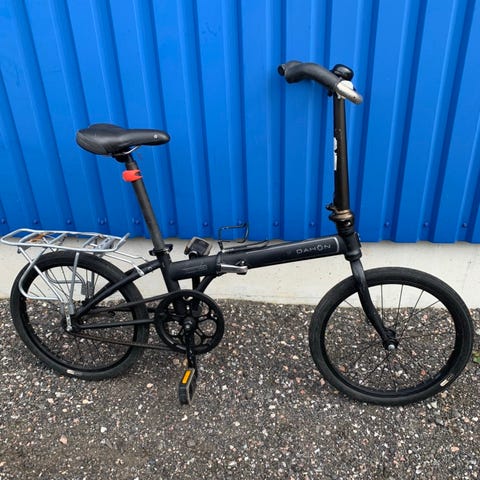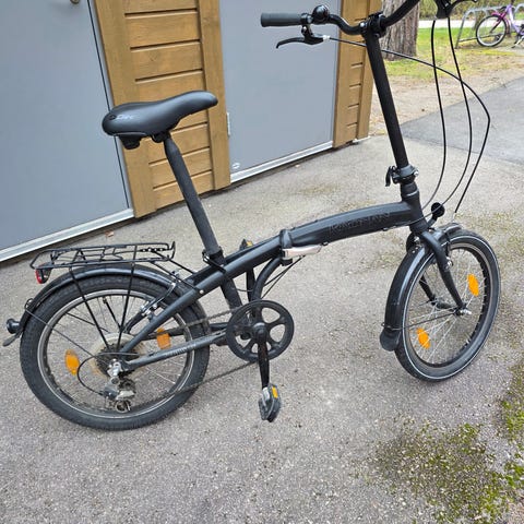 Nyservad cykel. Hopfällbar och blir mycket liten och lätt. Går lätt in i bil eller att ta på tåget. Går att bära i en hand. Passar på camping-semester mm.
