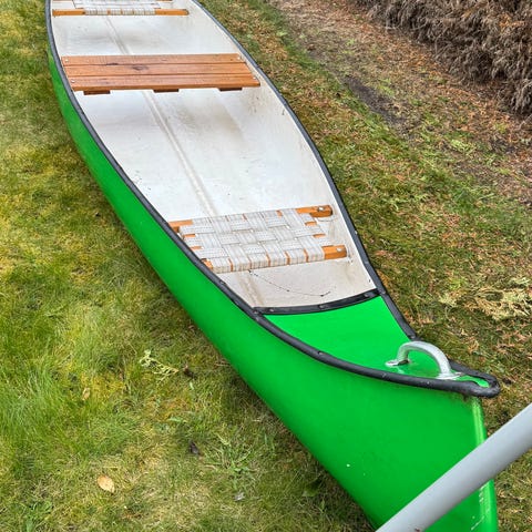 Omärkt kanadensare i glasfiber med måtten l= 4.70m x b=0.88m säljes.