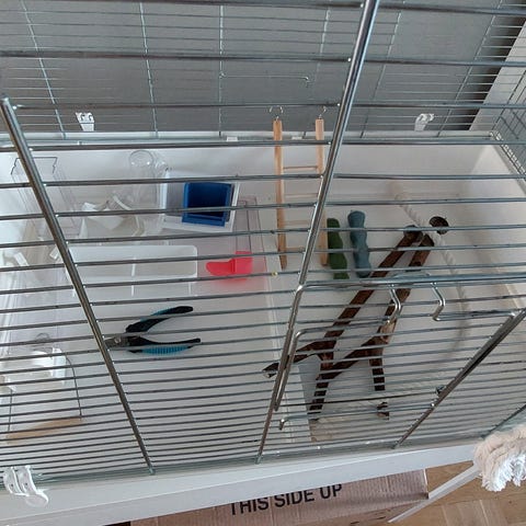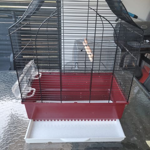 Vit fågelbur med plastbotten