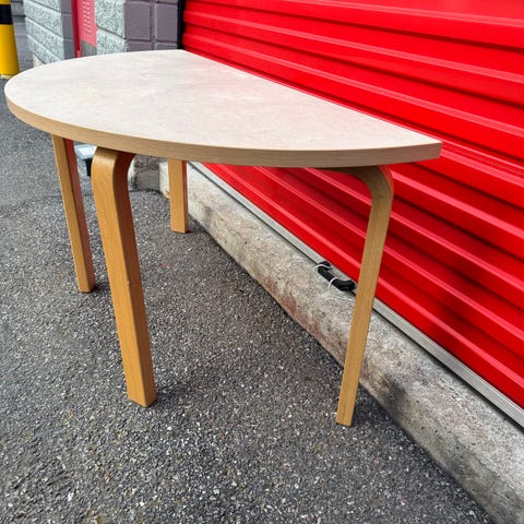 IKEA bord i halvformat formgivet av Alfred Homann. Bordet är vitt och har en halvcirkelformad bordsskiva med raka ben. Passar som avlastningsbord, sidobord eller konsolbord i hall, vardagsrum eller andra utrymmen där man vill ha ett smalt bord mot vägg.