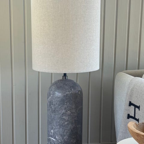 Lampan har inbyggd ljuskälla med dimmerfunktion, för att enkelt få det ljus som önskas, samt en stabil fot i grå marmor, med vit canvas som ovandel! (OBS första bilden är en annan färg på lampskärmen, medans resterande bilder är korrekta!)