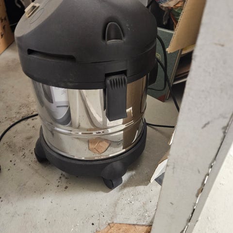 Våtdammsugare med behållare i rostfritt stål och blått lock. Utrustad med slang, elkabel och flera munstycken för olika typer av städning. Passar för grovstädning i exempelvis garage, verkstad eller förråd där både torr och fuktig smuts behöver tas upp. Ett hjul fattas men det går att rulla den ändå.