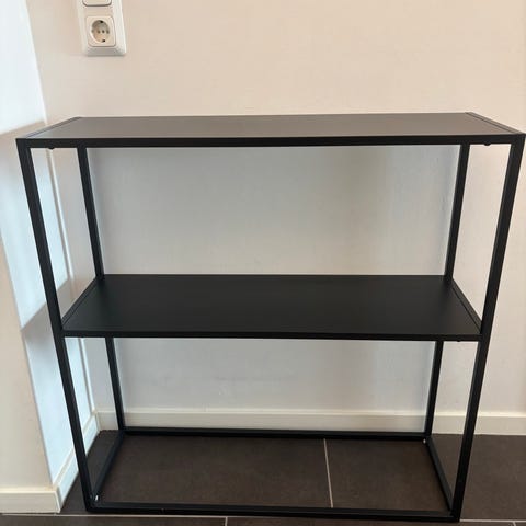 Snyggt stilrent sideboard i nyskick med svart ram i metall och 3 hyllplan i trä.