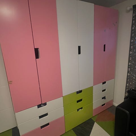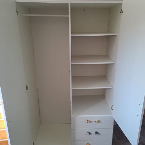 Plats för att hänga kläder. Finns även 2st lådor samt 2 extra inne i den vita. Plats för annat också i mitten.