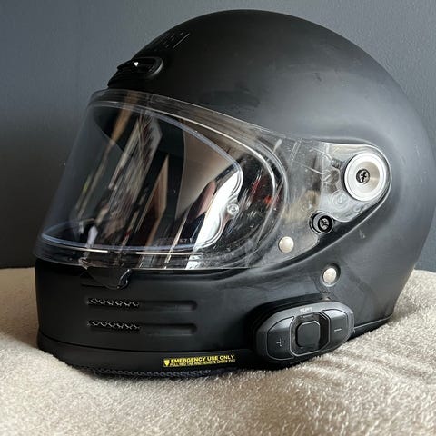 Shoei mc-hjälm i svart och rött med klart visir. O nerfällbart solskydd och pinlock. Hjälmen levereras med tillhörande skyddspåse.Till utrustningen hör också ett ryggskydd i svart med justerbara axelremmar och midjebälte. Dessutom flera par svarta mc-handskar med förstärkningar och skydd över knogar och fingrar.