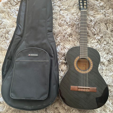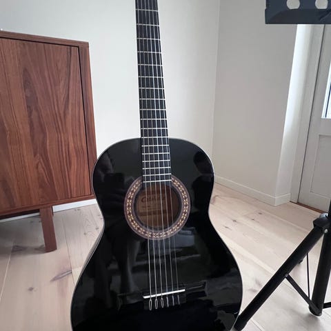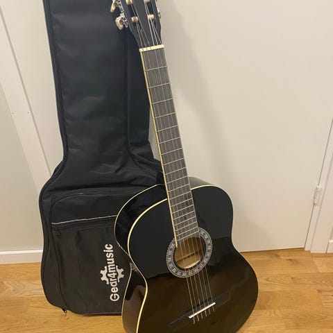 Gear4music klassisk akustisk gitarr i svart utförande. Säljer ett komplett nybörjarset med en klassisk gitarr som endast är använd under en termin. Allt är i mycket fint skick och redo för en ny spelare!