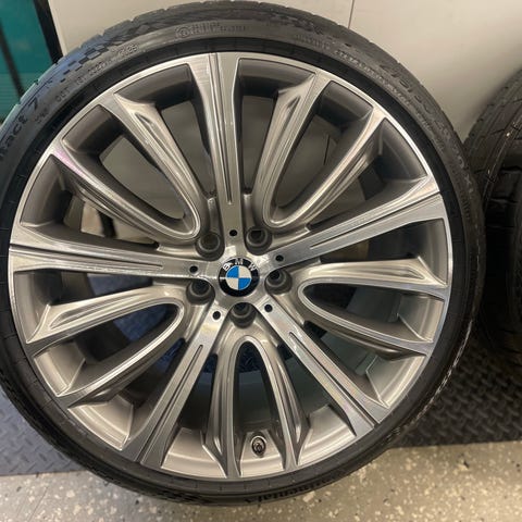 20” fälgar 20x9J ET25. En fälg hade sprickor så den svetsades förra sommaren. Hade tappat 1 bar i tryck medans det legat över vintern så inget jättestort läckage. Inga vibrationer under körning har jag haft heller. Annars gott skick på fälgarna enbart mindre skrapmärken enligt bild.