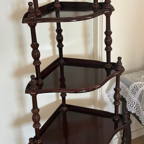 Säljer en stabil trähylla för blommor.