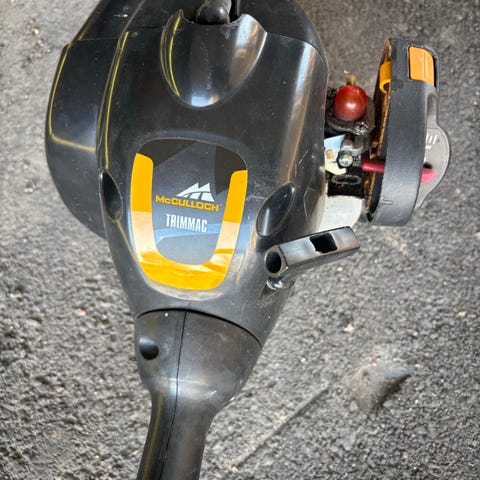 Partner Colibri II grästrimmer med bensinmotor. Maskinen har böjt riggrör och trådhuvud för trimning av gräs och ogräs runt kanter, rabatter och svåråtkomliga ytor. Gul motorenhet med svart handtag och skydd över trimmerhuvudet. Passar för användning i trädgård och runt tomt där finare grästrimning behövs.
