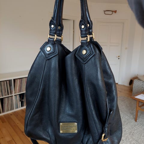 Marc Jacobs läderväska för kvinna i svart skinn. Väskan har dubbla handtag upptill samt en avtagbar axelrem. Utsidan är i präglat läder med metallskylt framtill. Invändigt finns textilfoder med logotryck och dragkedjefack samt öppna fack för mindre tillhörigheter. Passar för vardagsbruk och rymmer exempelvis plånbok, mobil, nycklar och mindre personliga saker.